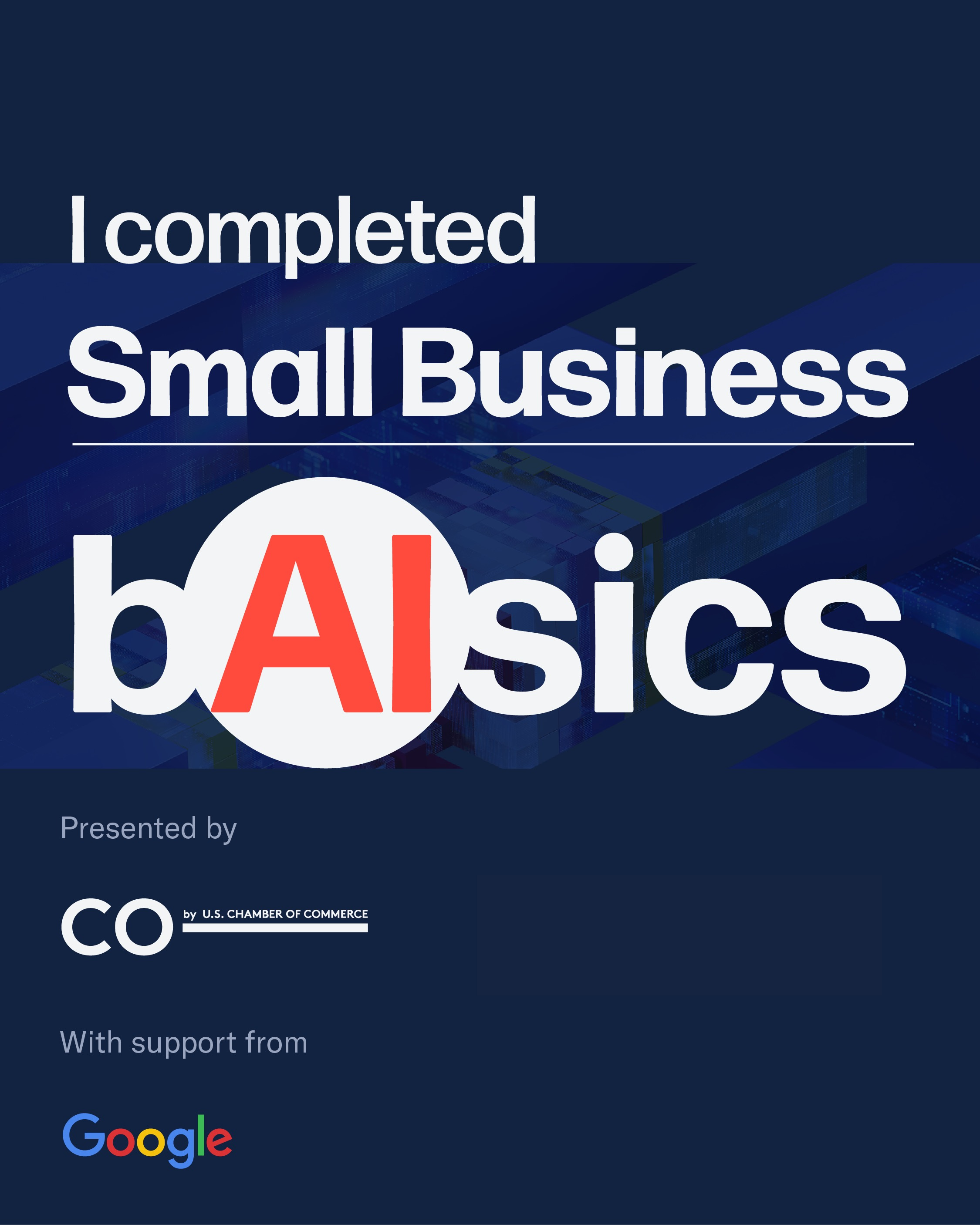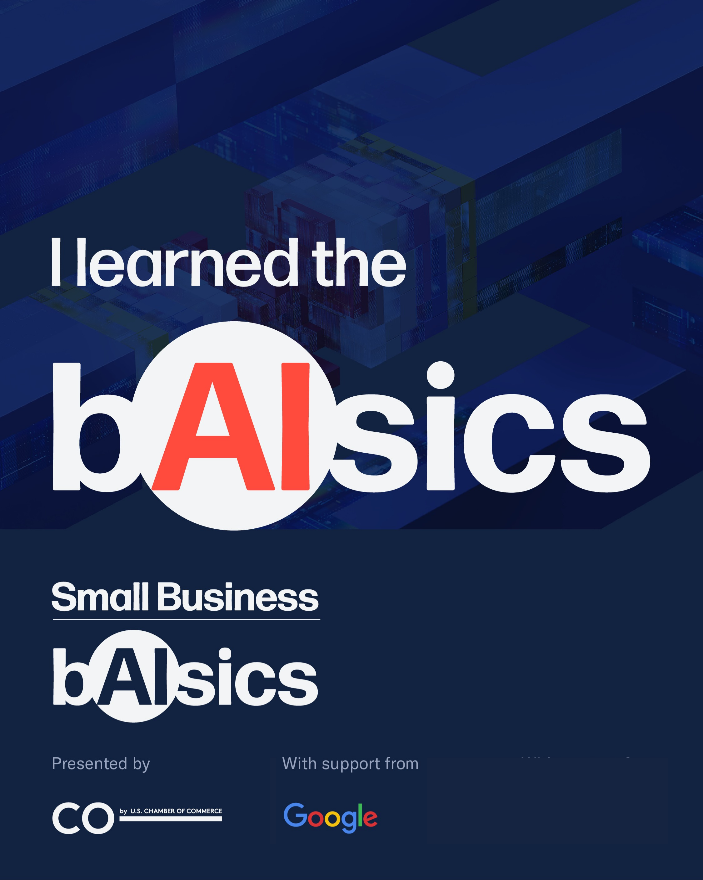 - I learned the B(AI)sics! 🎉 Just finished the free Small Business B(AI)sics AI course from @growwithCO with support from @Google. Quick, practical, and made for entrepreneurs. Learn more here: https://www.uschamber.com/co/small-business-ai-training