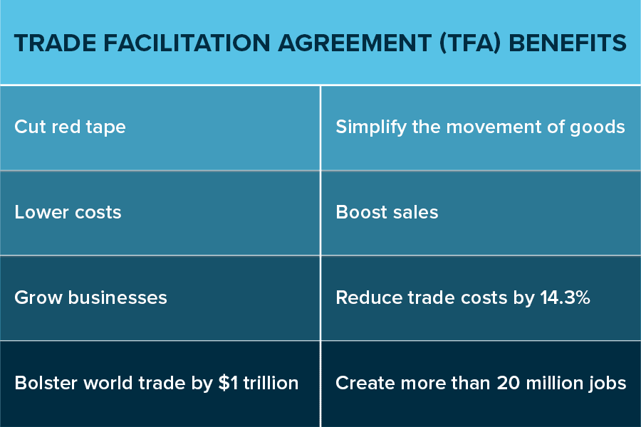 Good news is coming for small and medium-size businesses that want to reach billions of customers around the world. The World Trade Organization (WTO) is set to ratify a groundbreaking, but little talked about, new agreement known as the Trade Facilitation Agreement (TFA). This agreement will cut red tape and simplify the movement of goods across borders for the 164 countries that are WTO members.