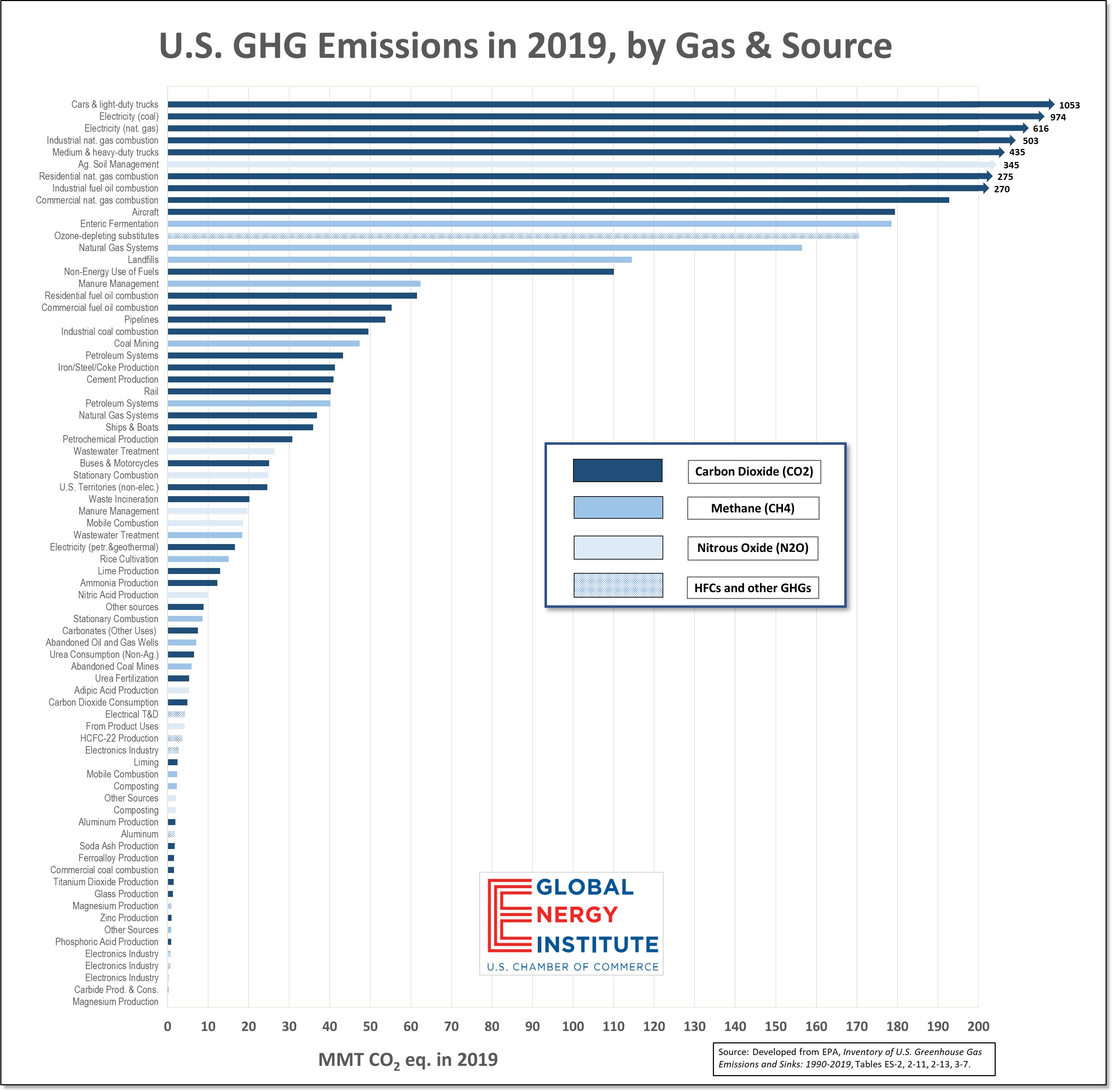 - While the largest eight source categories comprise 2/3 of gross economy-wide GHG emissions (4,447 MMTCO2e in 2019), the remaining 33 percent of emissions are spread amongst 68 sources, none of which individually represent more than 3 percent (or ~200 MMTCO2e) of annual emissions.