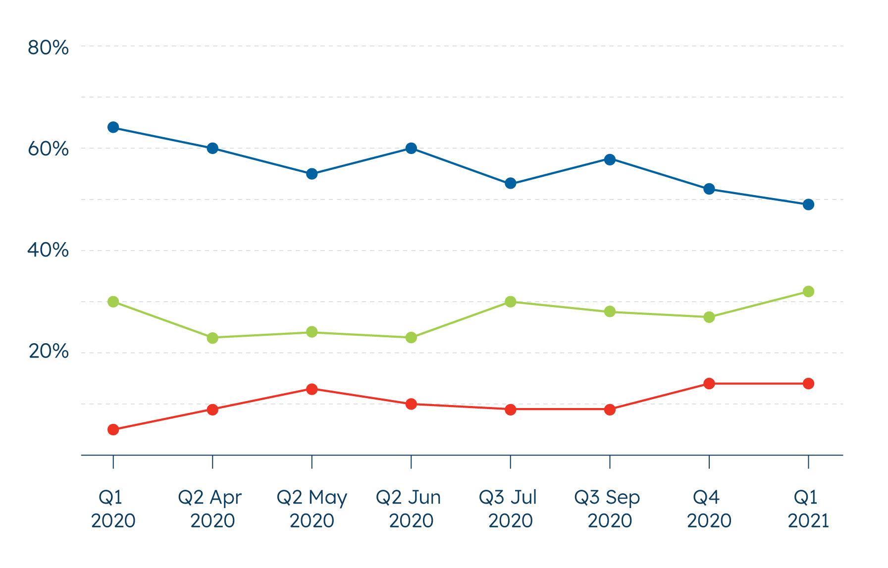 Despite a tough 2020, most small businesses report retaining the same size staff over the last year. However, more report reducing staff than increasing staff numbers. This quarter, fewer small businesses report retaining the same level of staff over the past year (55% in Q1 2021 vs. 64% Q4 2020). More say they reduced staff over the past year this quarter (27% in Q1 2021 vs. 18% in Q4 2020). However, only 16% said they had reduced staff over the past year in Q1 2020. This change in sentiment may reflect small businesses taking stock of the impact of the virus as we come up to the one-year mark and thinking more about changes to their business.