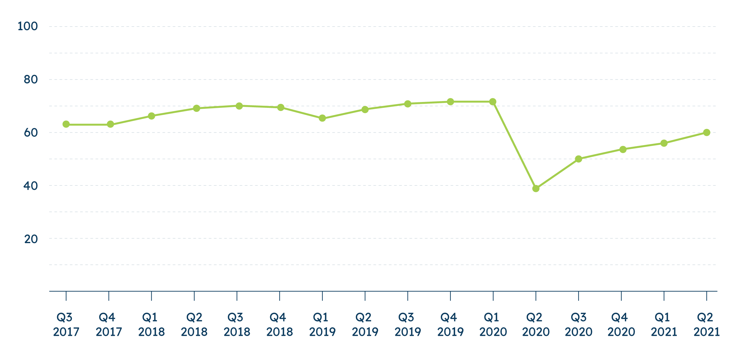 This quarter, the current Small Business Index score is 60.0 (an increase of 4.1 points from 55.9 in Q1).1 Nevertheless, the new score remains below findings before the pandemic: the Index score was 71.7 in Q1 of 2020 based on data collected before the full economic impact of the coronavirus became apparent. The Index reached an all-time low of 39.5 in Q2 2020 and the Index is now up a substantial 20.5 points since then.