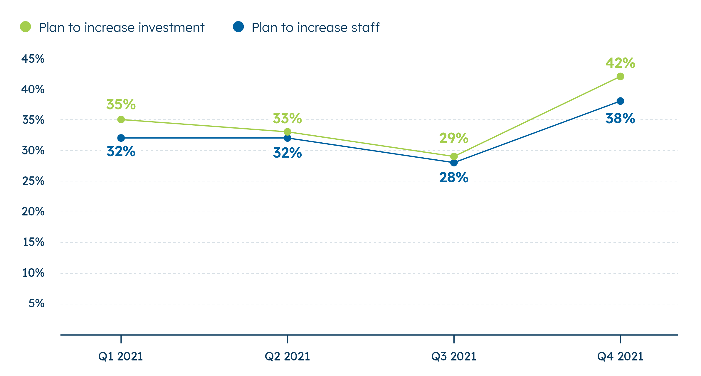 Meanwhile just under half (48%) now say they plan to retain the same size staff, a drop from 62% who said the same in Q3 2021. A larger share, about half, of medium-sized (51%), larger (52%), and manufacturing small businesses (48%) plan to increase their staffing levels in the upcoming year.