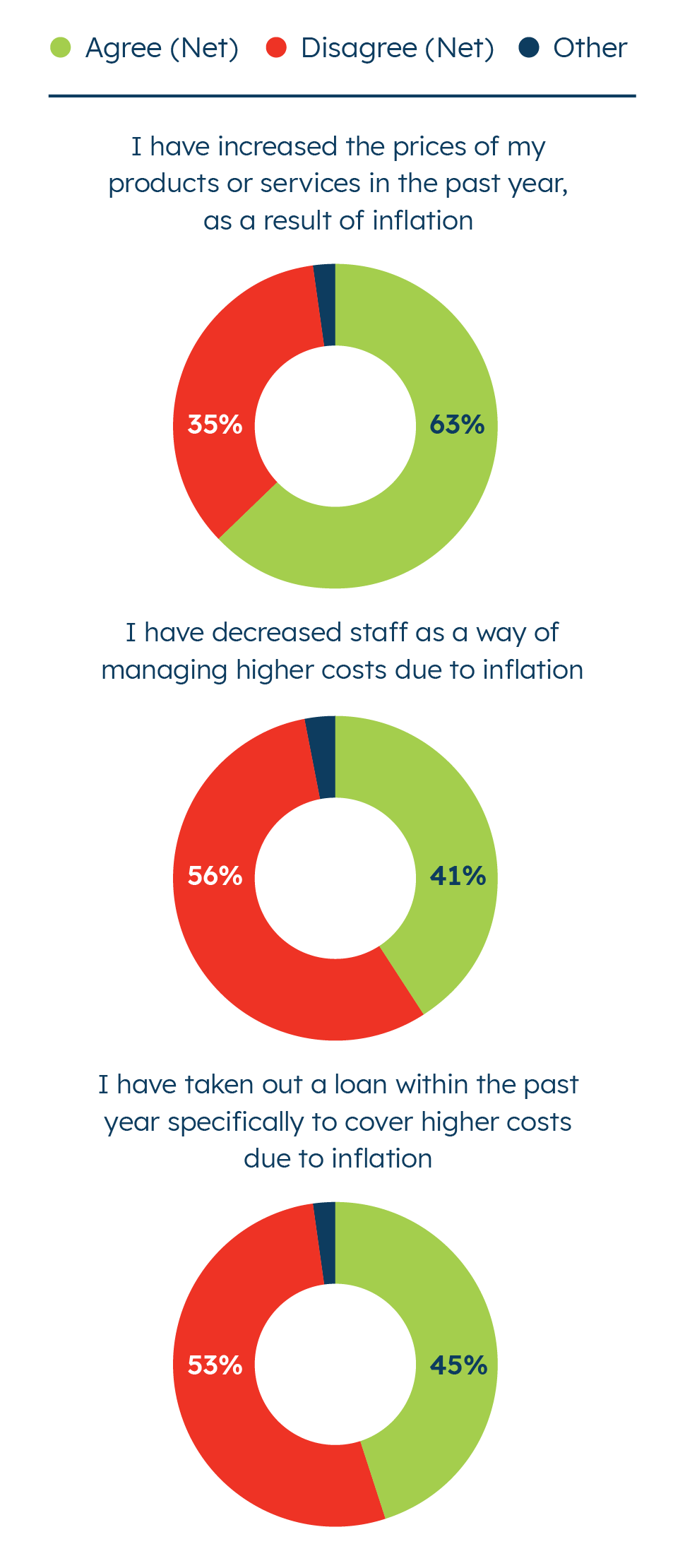 Sixty-three percent of small businesses say they have increased the prices of their own products and services in the past year. However, they also use other methods to manage inflation. Over two in five small businesses also say they have taken out a loan in the past year (45%) or have decreased staff (41%) as a way of managing higher costs due to inflation.