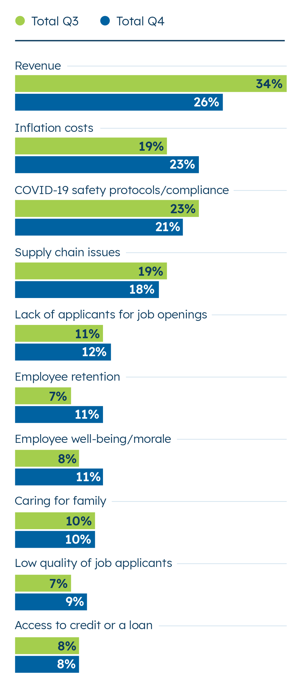 However, fewer small businesses say revenue is their top concern now than did in Q3 2021 (26% in Q4 vs. 34% in Q3), and revenue is now joined in the top tier of concerns by inflation and complying with COVID-19 protocols.