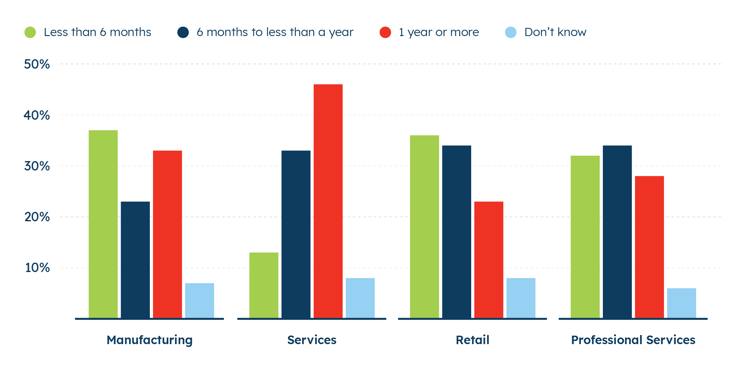 Small businesses in the services sector are the least optimistic about their supply chains, with only 13% saying they expect disruptions to be relatively short (last less than six months). Around 30% or more of small businesses across other sectors say the same. In fact, almost four in five small businesses in the services sector (79%) think their supply chain disruptions will last at least another six months.