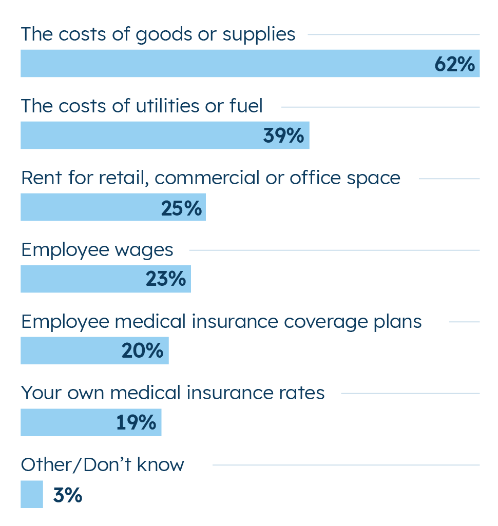 Among the small businesses that say rising prices have had a significant impact on their business in the past year, the impact is seen most dramatically in the cost of goods and supplies they themselves have to purchase. Further down the list of things driving inflation pressure are: the cost of utilities/fuel, rent, and employee wages. Inflation appears to be an economy-wide phenomena and small businesses are feeling it.
