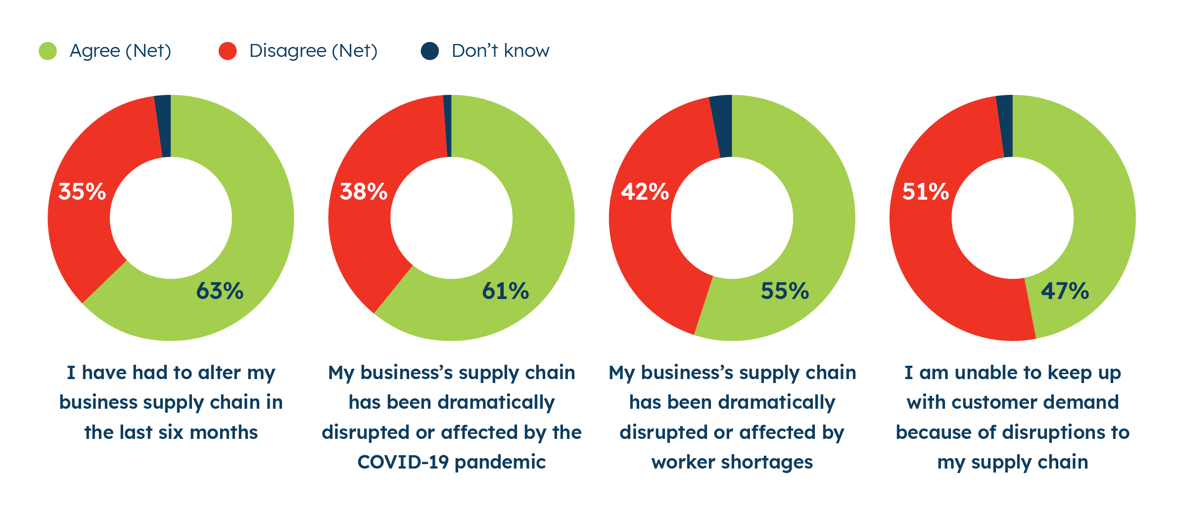 America’s ongoing worker shortage is also having a big impact on supply chains. A majority of small businesses (55%) say worker shortages have disrupted their supply chains. Sixty-three percent of small businesses say that they have had to alter their business’ supply chain in the past six months. All these supply chain disruptions may make it difficult for many small businesses to keep up with customer demand, with 47% of small business owners reporting that they are unable to do so.