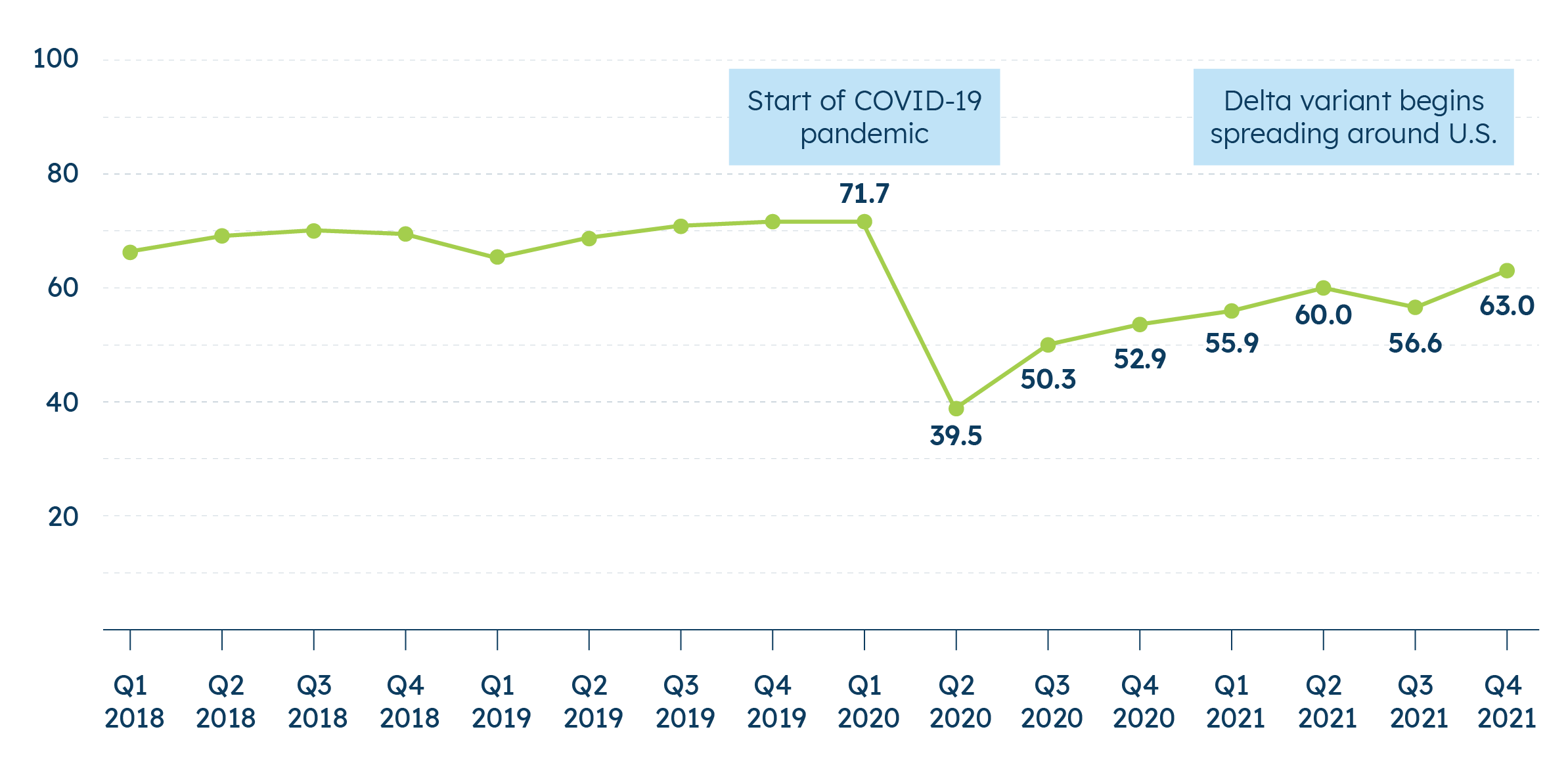 The MetLife and U.S. Chamber of Commerce Small Business Index score for Q4 is 63.0. The Index score for Q3 2021 was 56.6. In Q2 2020 it reached an all-time low of 39.5.1