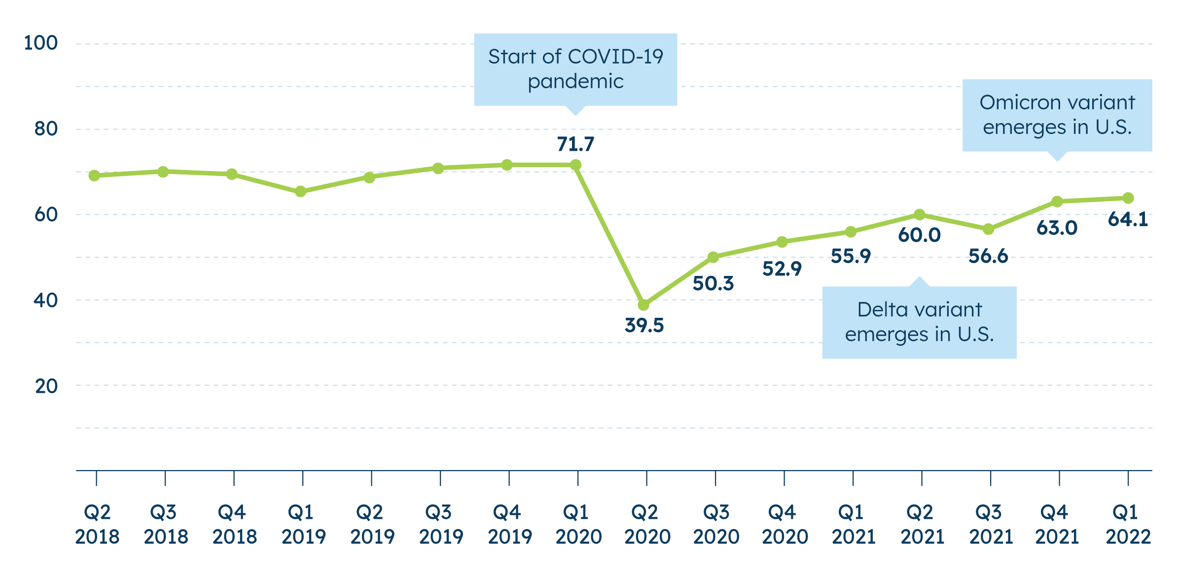 This quarter’s Small Business Index score is 64.1, the highest score since the start of the pandemic. This score is consistent with last quarter’s score of 63.0. (The low point of the pandemic was reached in 2020 Q2 when the score reached 39.5). This score comes after a tumultuous 2021, where the Index fluctuated more than usual, though ultimately it ended with increased optimism relative to the onset of the pandemic in 2020.