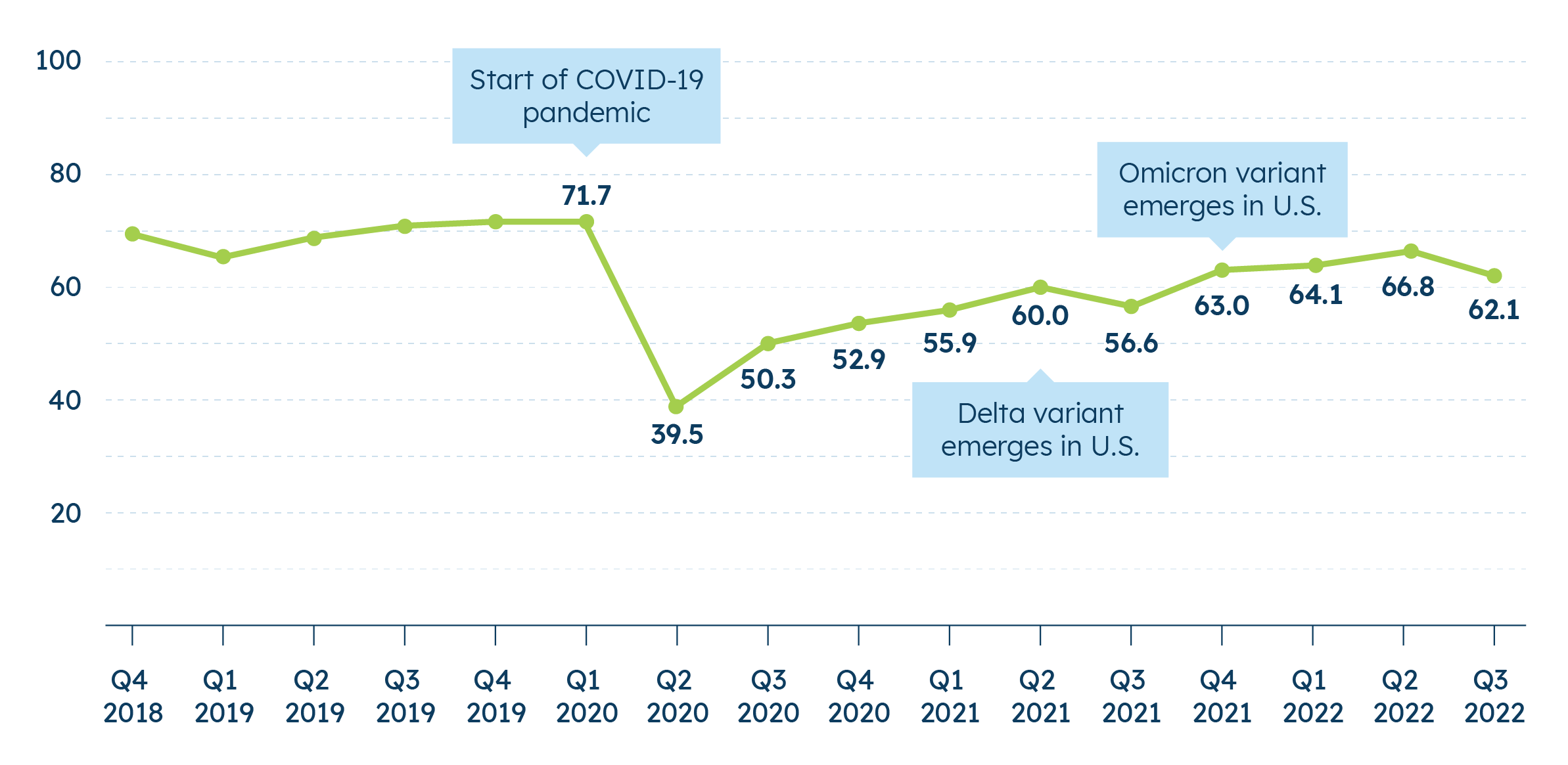 The MetLife and U.S. Chamber of Commerce Small Business Index score for Q3 is 62.1. The Index score for Q2 2022 was 66.8. At the start of the pandemic in Q2 2020, it reached an all-time low of 39.5.1