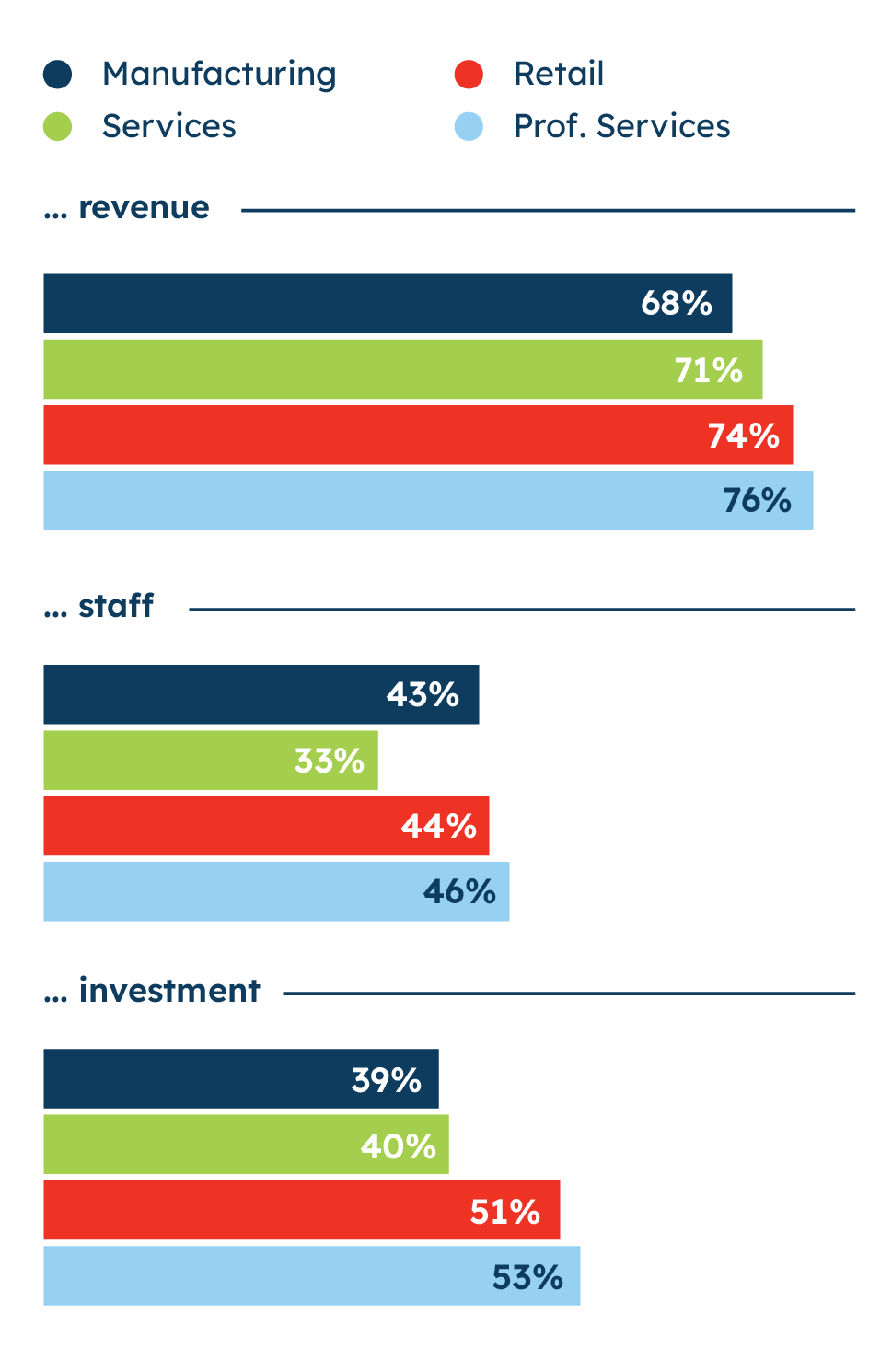 This quarter, small businesses’ plans for increased investment are consistent across business size, but small businesses with 5-19 or 20-499 employees are more likely than those with fewer than five employees to say they expect to increase staff or expect revenue to increase. By sector, small businesses in professional services are more likely than those in services to say they expect to increase staff or investment. There are no major differences by sector, however, when it comes to expectations for increased revenue in the next year.