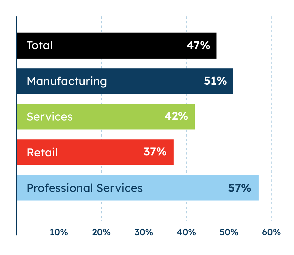 Small businesses in manufacturing (69%) and services (57%) are more likely than those in professional services (44%) to cite inflation as a key problem facing small businesses. About half (52%) of those in retail say the same.