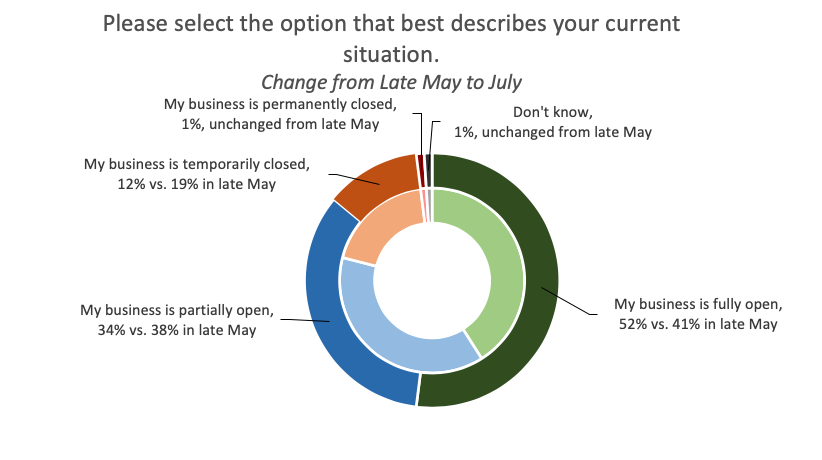 Almost 90% report their businesses are open in some capacity. 23% of small businesses report having temporarily closed at some point, unchanged from the end of May. In total, 86% of small businesses report that they are fully or partially open.