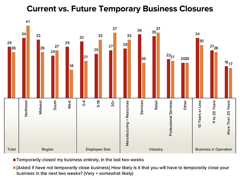 - Temporary closures continue. Three in ten (29%) businesses say they have temporarily closed their business in the last two weeks (24% said so last month). More than one in five small businesses (22%) say they are two months or less from closing permanently