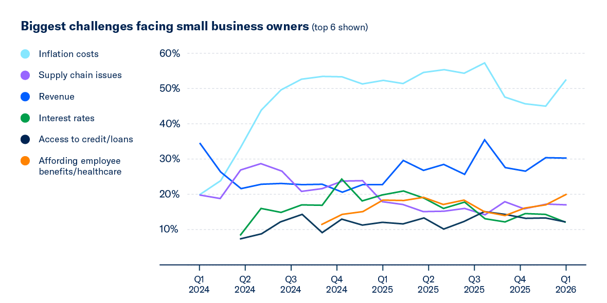 Nearly one in five (19%) small businesses say affording employee benefits or healthcare is a top challenge, up from 14% at this time last year. This is highest reading for this measure since tracking began in Q1 2023. On the other hand, concerns about employee retention (9%) fell sharply compared to last quarter (17%).