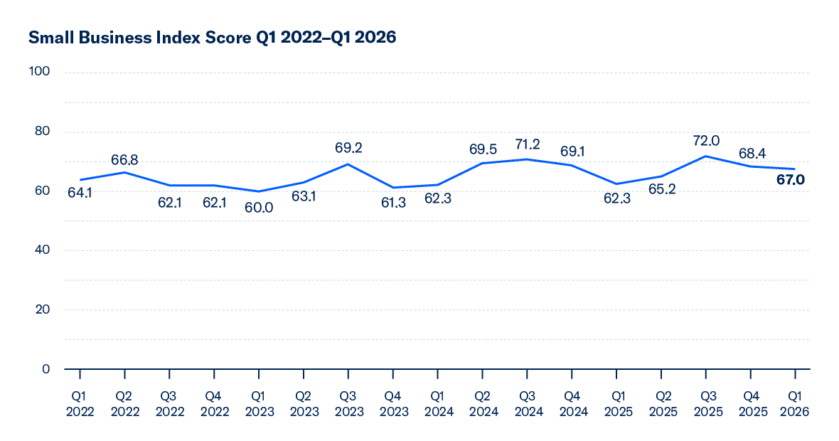 The Small Business Index is 67.0 this quarter, down slightly from 68.4 last quarter but higher than Q1 2025 (62.3).