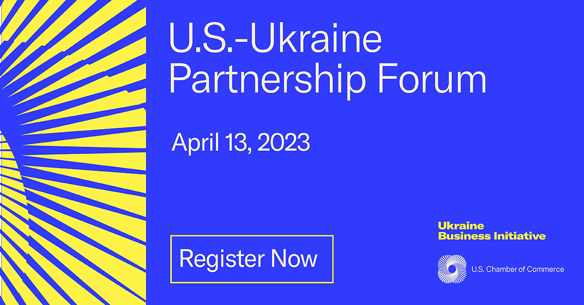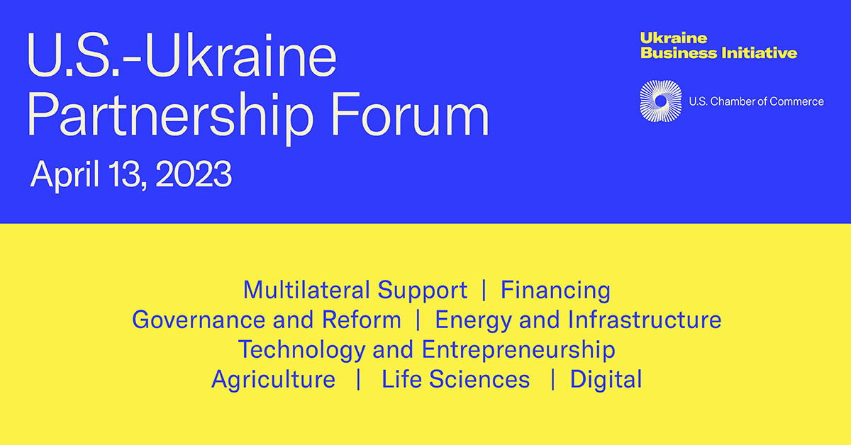 - We’re excited to join @USChamber, @StateDept, @CommerceGov, and @USAID for the U.S.-Ukraine Partnership Forum to discuss how governments and the private sector can work together toward a dynamic economic recovery in Ukraine. More: https://events.uschamber.com/usukrainepartnershipforum/3200426 #UkraineBusinessInitiative